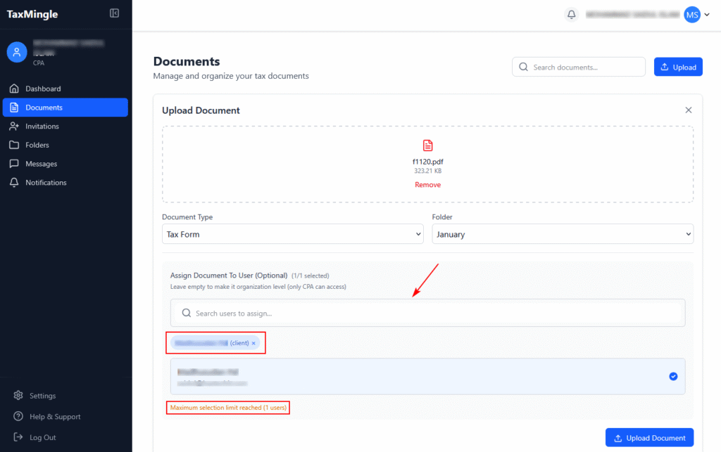 Use the search bar under Assign Document To User (Optional) to find and select the client the document belongs to. You can assign it to one client only. Leave this empty if the document is for internal (organization-level) use.
