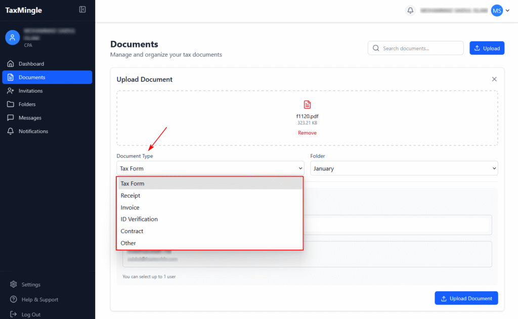 From the dropdown labeled Document Type, choose the appropriate category for your file (e.g., Tax Form, Invoice, Receipt, etc.).